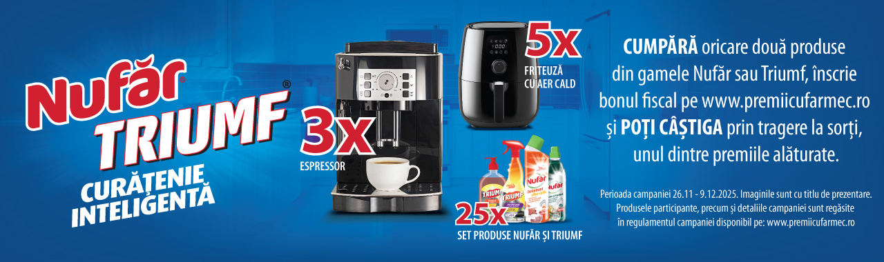 Achiziționează din magazinele Profi, oricare două produse de curățenie din gamele Nufăr sau Triumf, înscrie bonul fiscal aici si poți câștiga :