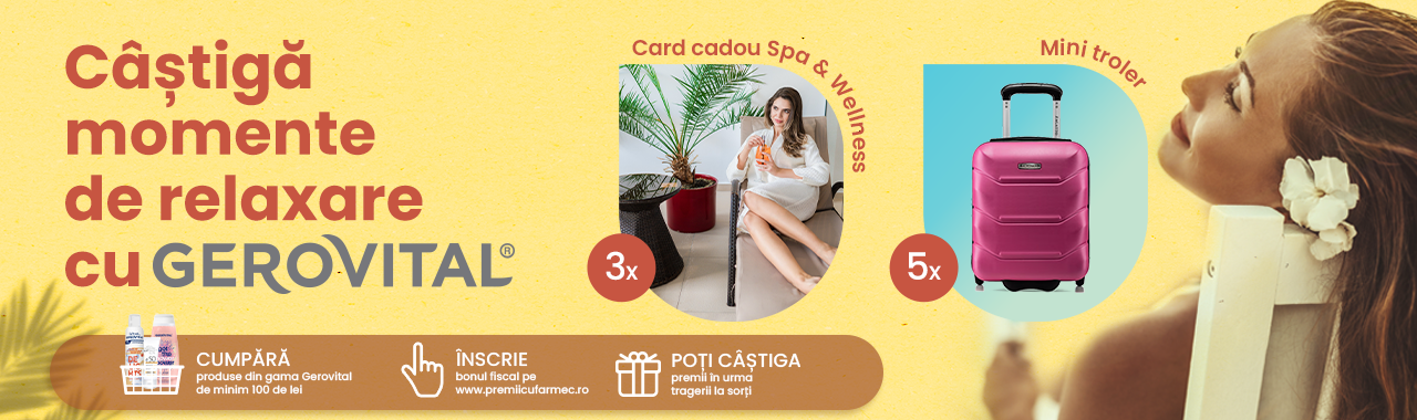 Achiziționează produse Gerovital de minim 100 de lei/bon fiscal, din magazinul Gerovital Electroputere Craiova, înscrie bonul fiscal aici si poți câștiga, prin tragere la sorți: