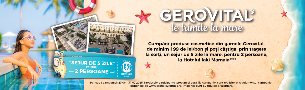 Achiziționează produse Gerovital de minim 199 de lei/bon fiscal, din magazinele Farmec și Gerovital participante*, înscrie bonul fiscal aici si poți câștiga, prin tragere la sorți: