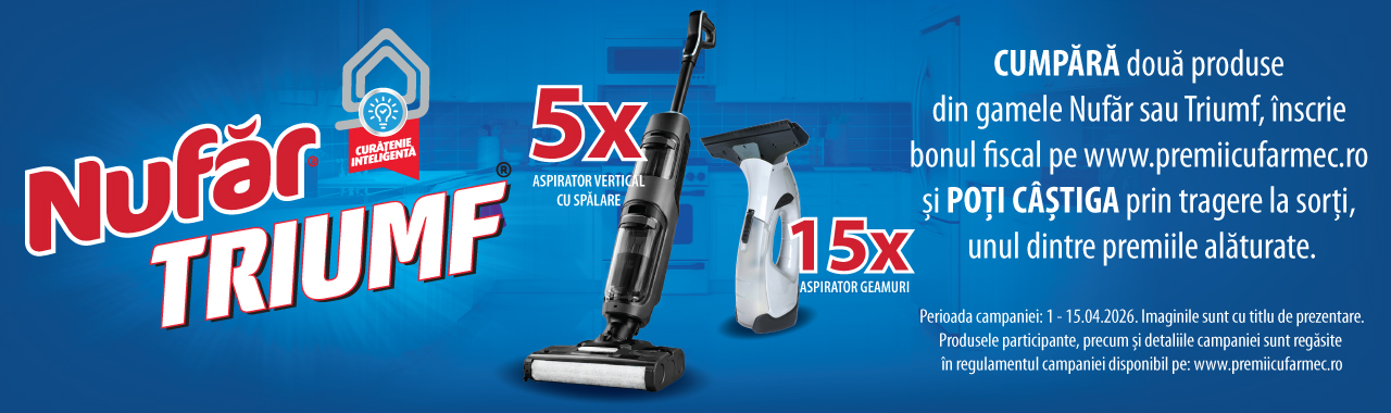 Achiziționează din hypermarketurile Carrefour oricare două produse din gamele Nufăr sau Triumf, înscrie bonul fiscal aici și poți câștiga: