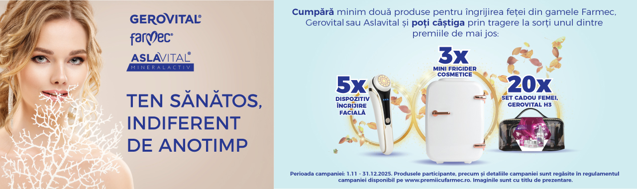 Achiziționează minim două produse pentru îngrijirea feței din gamele Gerovital sau Aslavital, înscrie bonul fiscal aici și poți câștiga: