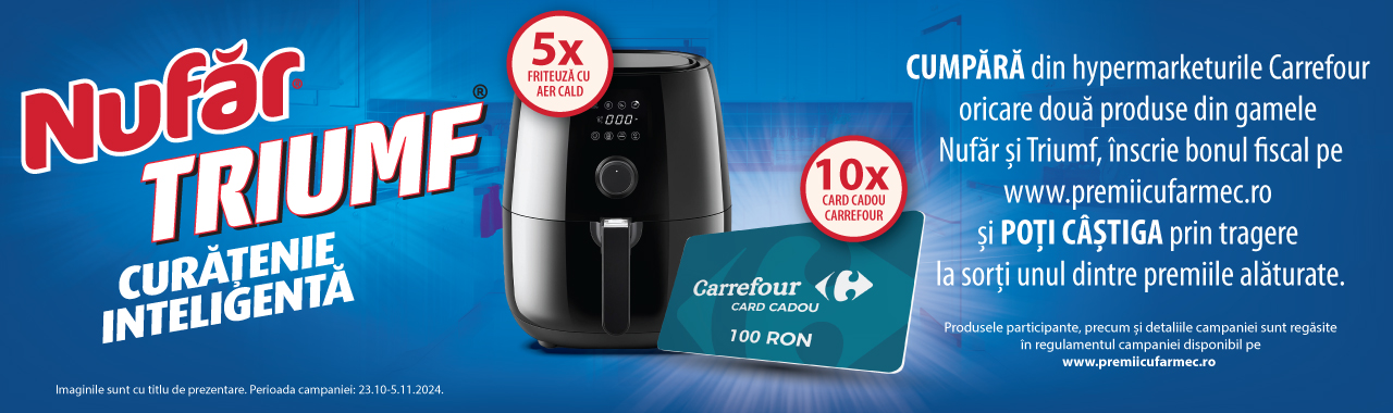 Achiziționează din hypermarketurile Carrefour oricare două produse din gamele Nufăr sau Triumf, înscrie bonul fiscal aici și poți câștiga: