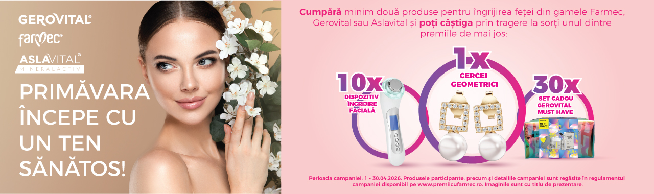 Achiziționează minim două produse pentru îngrijirea feței din gamele Gerovital sau Aslavital, înscrie bonul fiscal aici și poți câștiga: